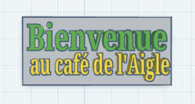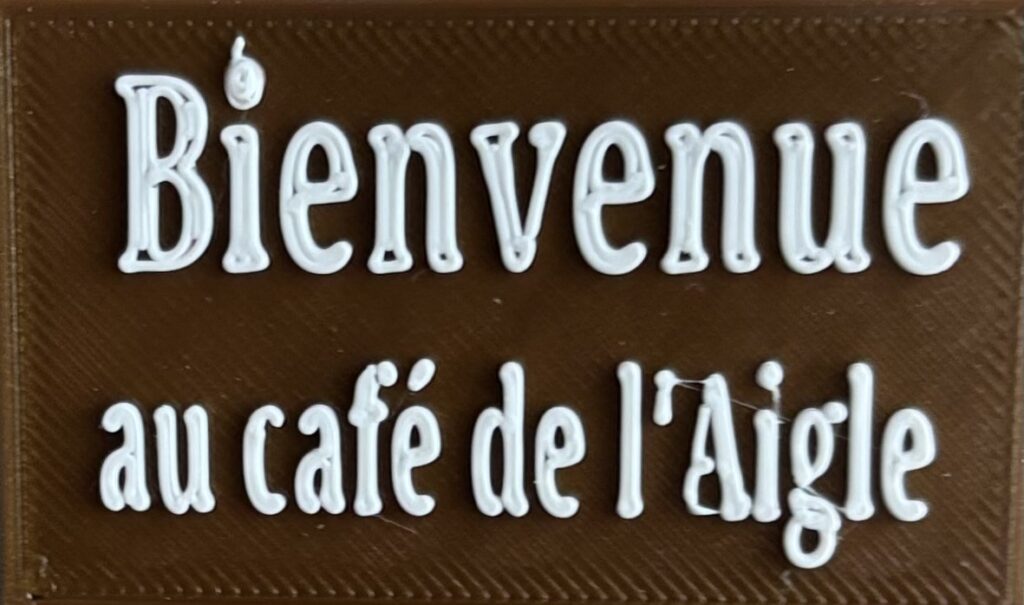 J’utilise le programme « tinkercad » pour réaliser cette impression. J’ai crée deux textes épaisseur 3 mm. J’ai déposer ces deux textes sur la base, ils vont dépasser de 1 mm. L’impression va se faire en deux temps, impression de la base avec un filament brun. L’impression s’arrête et je dois changer le filament, filament blanc.