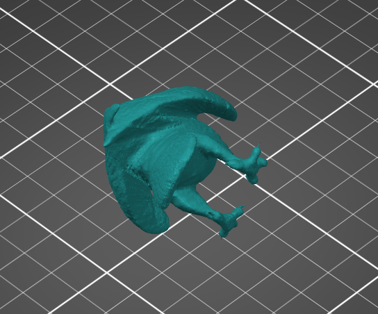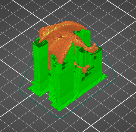 L’aigle avec ses supports. Pour imprimer correctement on doit installer des supports en vert, ces supports seront délicatement enlever en faisant attention de ne pas abimer les parties délicates comme les pattes.